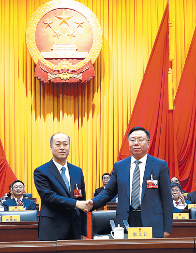 市委书记郭灵计和新当选的市长陈德明亲切握手。 李敬元 摄
