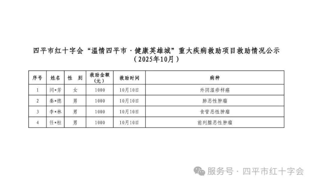 四平市红十字会“温情四平市·健康英雄城”重大疾病救助项目救助情况公示