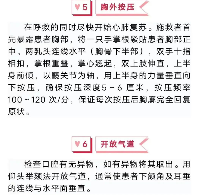 传统的心肺复苏包括胸外按压、开放气道和人工呼吸三个步骤,若施救者不能或不愿意进行人工呼吸,可只进行胸外按压。此时,胸外按压应连续进行,以每分钟100~120次的频率按压,直到患者出现复苏有效的指征或者有专业急救人员到达现场。但是,对于缺氧性心搏骤停的患者(如溺水、呼吸道阻塞)和儿童、婴儿等,应实施传统的心肺复苏。