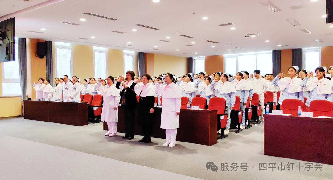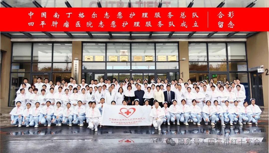 市红十字会、市卫健委相关领导对志愿护理服务队的成立表示祝贺,希望护理志愿者们发扬“人道、博爱、奉献”的红十字精神,将专业的护理知识和技能,带到社区、学校、家庭,为有需要的人们送去温暖和关怀。   市红十字会领导为四平肿瘤医院志愿护理服务队授旗。中国南丁格尔志愿护理服务总队副理事长应岚向肿瘤医院护理服务队副队长殷慧智赠送南丁格尔画像,象征着使命的传承与责任的交付。   随后,在应岚、张桂英副理事长的带领下,全体护理志愿者进行庄严宣誓,承诺将恪守红十字精神,奉献爱心,服务社会。